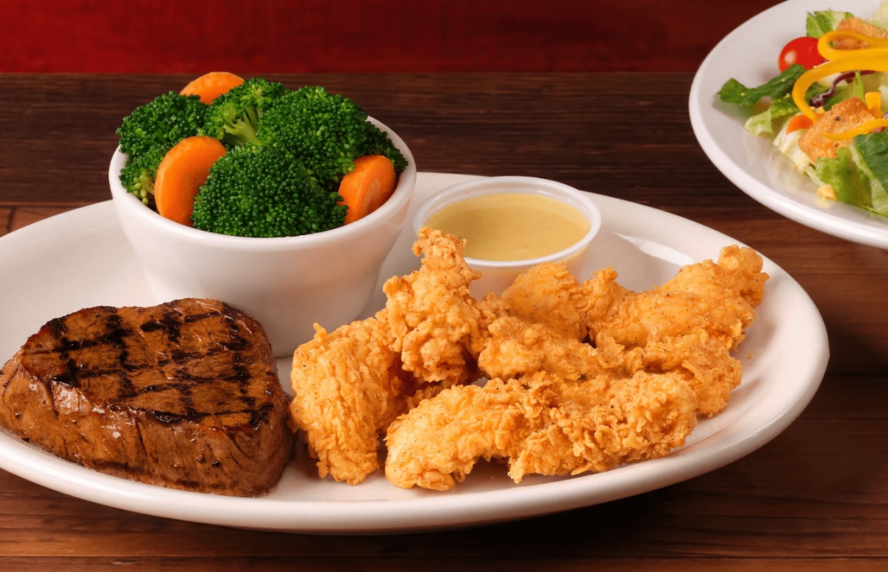 All white meat chicken tenders dipped in buttermilk batter, then hand-breaded and golden-fried along with our lean, juicy sirloin steak at a great value ($21.99 - 520 cal)