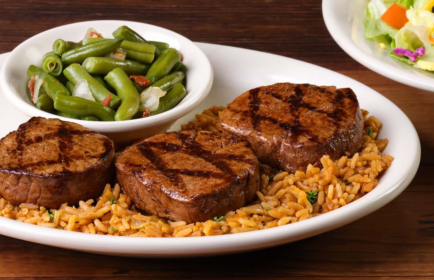 Three tender filets (9 oz. total) topped with choice of Peppercorn or Portobello Mushroom sauce and served over seasoned rice ($21.99 - 970 cal)