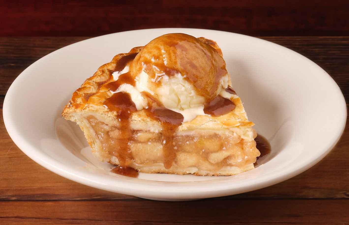 Homestyle slice of apple pie topped with vanilla ice cream and honey cinnamon caramel sauce ($6.99 - 1110 cal)