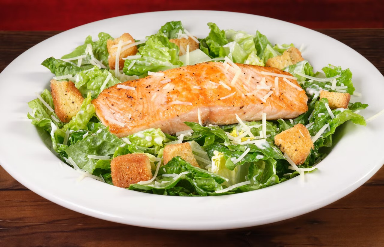 Grilled salmon tossed with crisp hearts of romaine, parmesan cheese, croutons and zesty Caesar dressing. ($18.99 - 1110 cal)