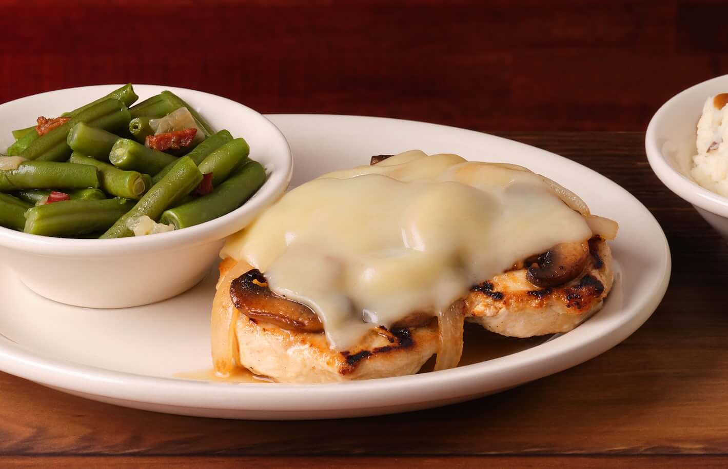 Chop steak smothered with sautéed onions, sautéed mushrooms and jack cheese. Served with your choice of two sides. ($12.49 - 760 cal)