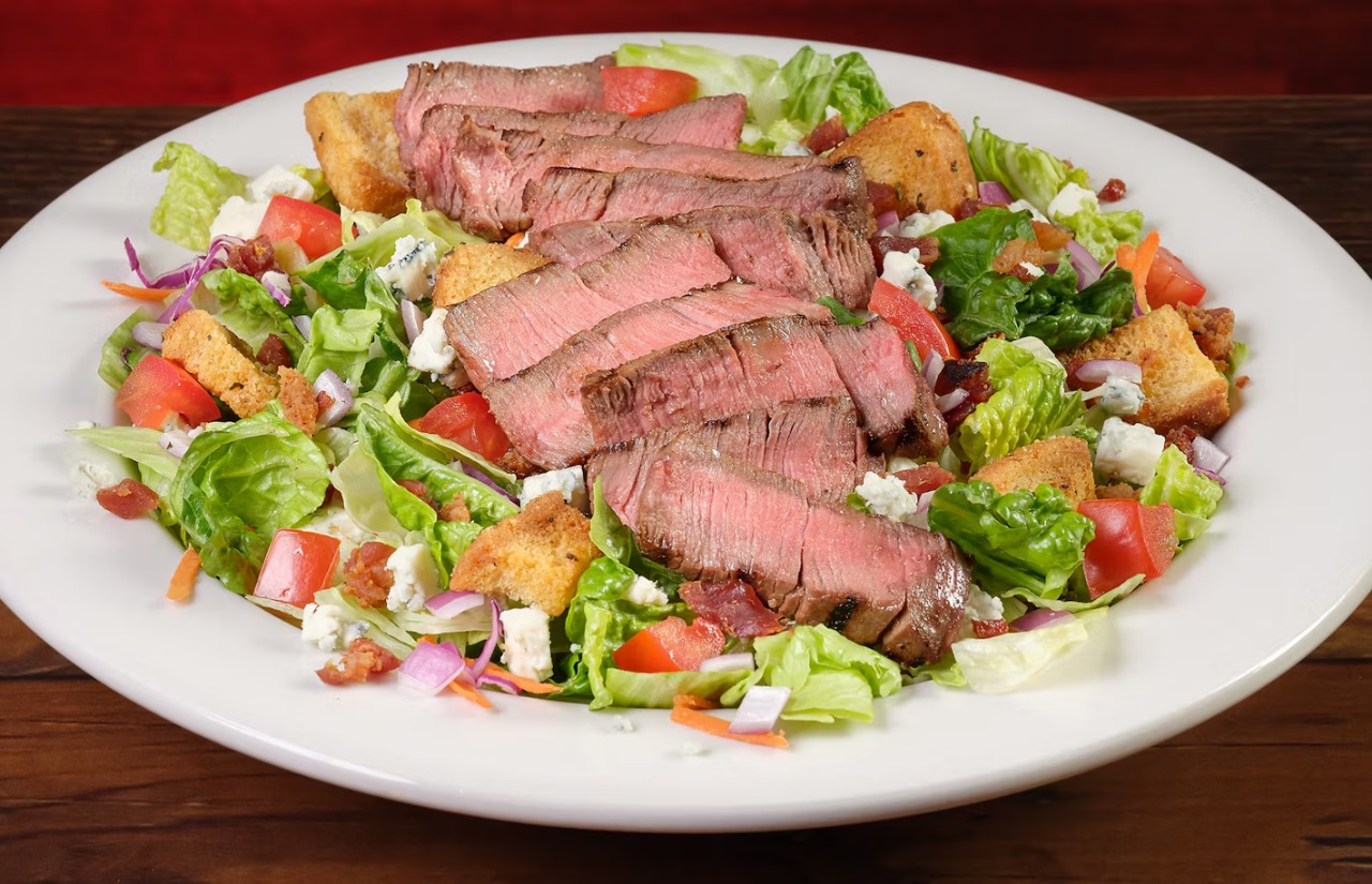 Salad greens drizzled with Italian dressing, topped with tender filet strips, Bleu Cheese crumbles, bacon bits, red onions, tomatoes and croutons, and served with a side of creamy Bleu Cheese. ($20.99 - 1340 cal)